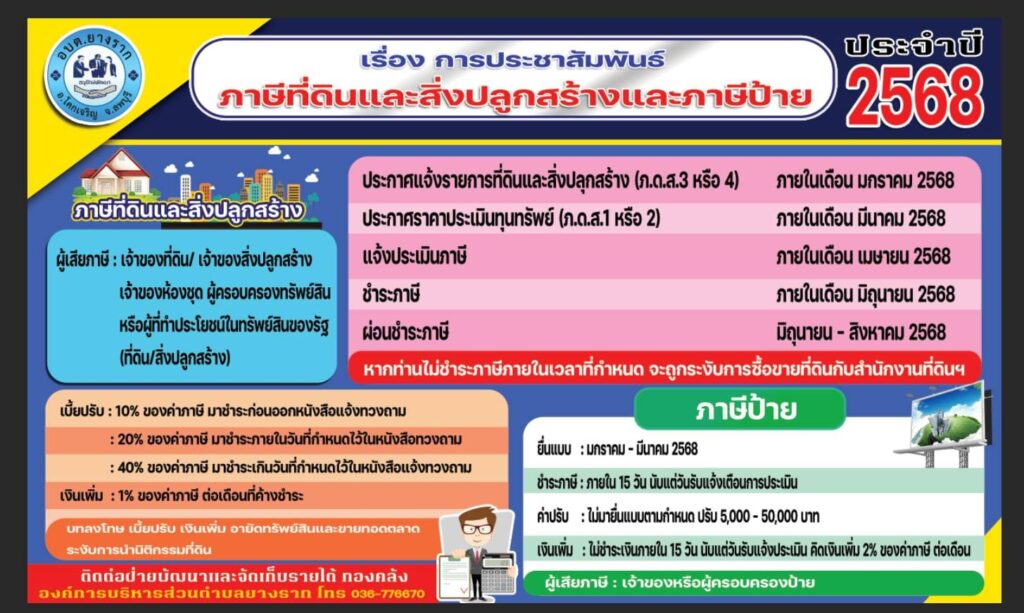 ประชาสัมพันธ์ เรื่อง การชำระภาษีที่ดินและสิ่งปลูกสร้างและภาษีป้าย ประจำปี 2568 สามารถติดต่อสอบถามได้ที่งานจัดเก็บรายได้ กองคลัง องค์การบริหารส่วนตำบลยางราก โทร. 036-776670